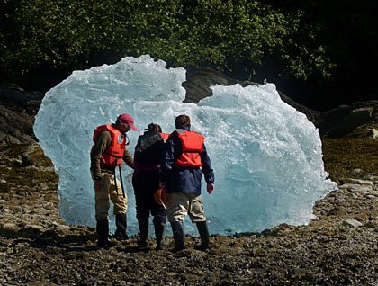 Brilliant blue sky and dazzling sunshine greeted us on this first day of August as we approached the entrance to Tracy Arm and our destination at William’s Cove. We spent the morning hiking, kayaking, and exploring aboard our expedition landing craft in this quiet bay. Bears often travel parallel to shore just within the trees. We followed their routes through carpets of moss and ferns shadowed by spruces and hemlocks. We also walked through a meadow margin that separates the forest from the sea. Blossoms of yarrow, paintbrush, and silverweed splashed color across the vivid green background. Kayakers paddled past sea ducks called scoters, marbled murrelets, and pigeon guillemots to get a close look at a floating piece of ice. Those who opted for a motorized cruise poked along the water’s edge and at one spot climbed out to examine a stranded bergie bit grounded in the seaweed. Eventually all returned to the ship, and the engines sprang into action. Before we even left the bay, several of the guests spotted two killer whales. The ship immediately slowed and turned to allow better views of these handsome and charismatic animals. Their tall dorsal fins rose, often in synchrony, over and over again. We could have stayed for hours, but the glacier, still many miles away, lured us on.