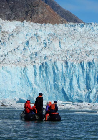 Our morning anchorage was at a place called Williams Cove. Most of us took advantage of one last chance to get our rubber boots dirty. We followed a bear trail along the edge of a scenic forest, occasionally dipping out of the woods and into the tall grass and the rocky shoreline. The second half of our morning found us back on the water, either in kayaks or expedition landing craft, where we explored the shoreline, admired a brilliant blue iceberg, and discovered a hidden waterfall.