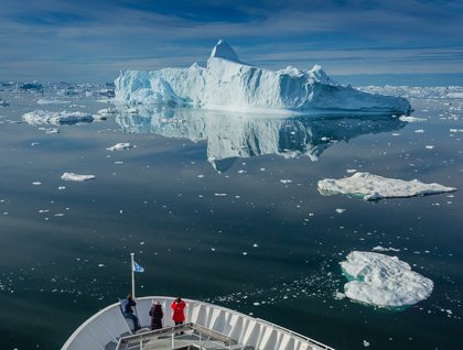 Once everyone was back on board, our photo instructor gave a presentation to provide suggestions for those with cameras of all types and sizes as we continued deeper into the fiord. National Geographic Sea Bird cruised beneath towering majestic cliffs shaped by glacial ice. It was like being a part of a postcard scene. Over the PA came the word that we could see mountain goats from the decks. What a surprise to see a female and her kid right at water level, obtaining salt by licking the intertidal rocks. They seemed unconcerned about the ship, so we managed to get excellent views. Perhaps we looked just like another iceberg drifting by.