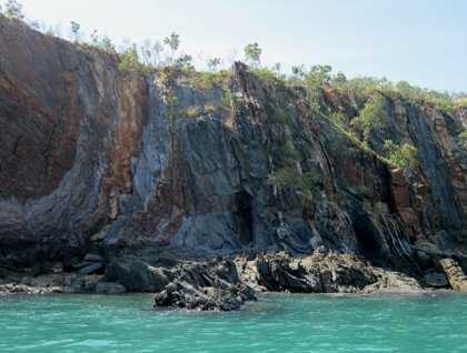 We begin our explorations in the afternoon after a hearty lunch served in the outdoor café on the aft deck. The Zodiacs follow the rocky coastline in Yampi Sound, darting in and out of small bays. To our surprise, the rock layers are wildly twisted and contorted into great folds called anticlines and synclines. We learn that the sandstones were deposited in an ancient sea nearly two billion years ago and were later deformed during plate tectonic movements that assembled Australia’s basement rocks that we see today. This geologically significant area is also rich in minerals, with vast open-pit mines still active today that have yielded more than 100 million tons of iron ore over the decades.