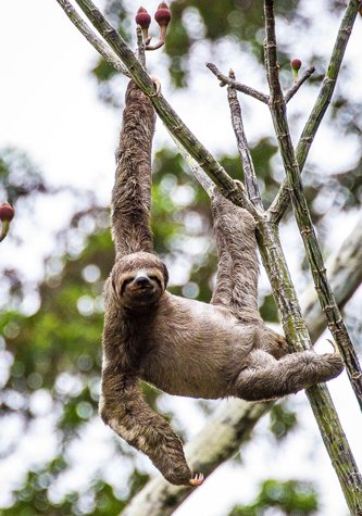 The scenery and the weather were great this morning on Yanalpa. We got to see the iconic giant Amazon lily pads, and a couple of three-toed sloths hanging at the treetops, stretching in odd uncomfortable-looking yoga-like postures. What an odd animal is the sloth. As we approached the sloths to see them better they very slowly looked down at us, seeming effortless as if to show us how strong and flexible they have adapted to be to life up in the trees.