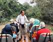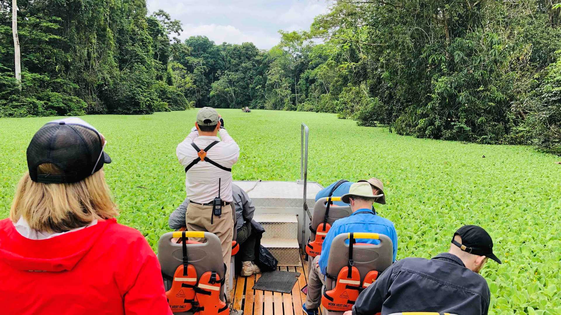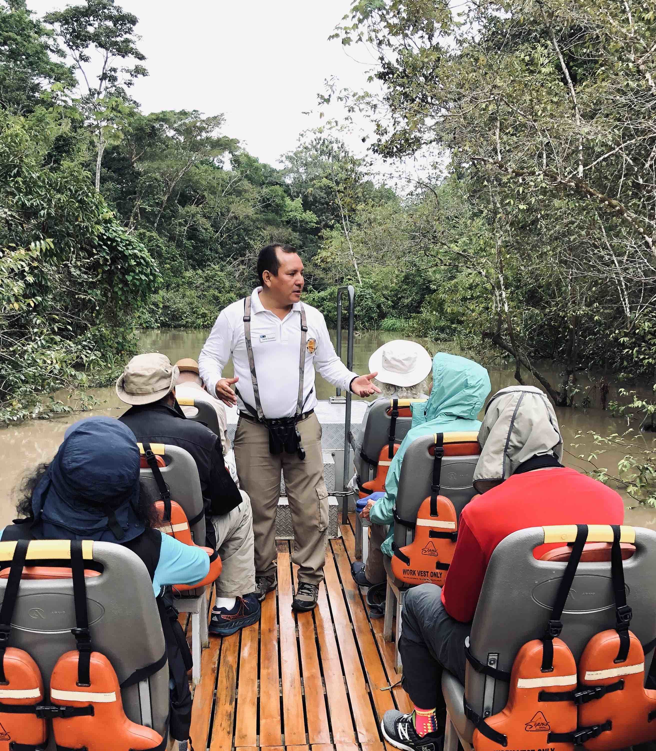 We have had an astonishing week full of the kind of unfathomable experiences that only happen once in a lifetime. Tomorrow, we will be back to another jungle built with cement and other kinds of wildlife. But this morning, we are visiting a very small community at the foot of the Amazon River. People living here are poor in possessions but rich in a very natural way of living, and you see very happy people everywhere. Our guests enjoyed interacting with locals, eating their food, and learning how they use local materials found in the jungle for agriculture, fishing, and handicrafts. Minga Peru is a non-governmental institution. The Lindblad Fund supports these communities in the Upper Amazon through education and by empowering people, especially women, to develop job skills, create jobs with better incomes, and eradicate domestic violence. In the afternoon, we went to Casual Forest. With the help of some local, expert guides, we explored the jungle. The site is home to many creatures, like tarantulas, tiny frogs, and boas. We observed many medicinal trees. This outing was a great learning experience for our guests. Once we got back on board, we enjoyed a farewell cocktail party with all the crewmembers. Our guests were very happy after a great week exploring the Amazon of Peru. Our week was very special. We found capybaras and large caimans during our nocturnal outing, and the highlight was spotting a big jaguar resting on the riverbank of the Pacaya-Samiria Reserve. To celebrate the end of our memorable journey, our talented crew performed in the dining room. They played some local music and danced. We will depart in the morning for Iquitos, where we will visit the Manatee Center and the city’s boulevard. We had a wonderful time together. We made new friends and will remember this trip forever. Cheers to Peru!