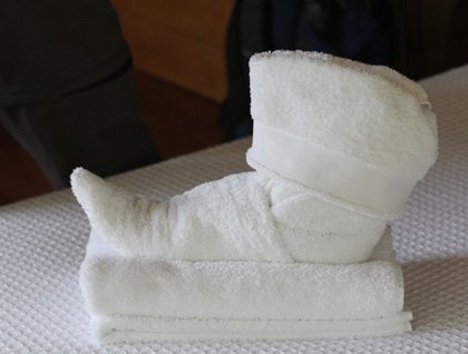 After breakfast we strolled down the river again, to explore it fully, and this time we had a group of squirrel monkeys jumping from tree to tree. It was a very special moment in the rain forest; then, on our way back to the ship, we made a stop in a very small native community where Lindblad is planning to develop a help project, to give back some of the wealth that we enjoy in the river every day. We also had the opportunity to admire their handicraft work and meet the kids, still untouched by the urban civilization. Soon after we started our motors to reach our next destination. Before lunch we learned how to fold towels in the very original way of the Delfin II, by our master folders the cabin boys.