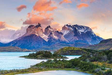 In the Magellanes region of southern Chile, Torres del Paine National Park spans 450,000 acres between the Andes Mountains and the Patagonian Steppe. In addition to its eponymous mountain range, the ecology is made up of glaciers, lakes, rivers, lagoons, and four distinct vegetation zones: the wind-bent grasses of the steppe, the pre-Andean scrub of the plains and plateaus, old-growth deciduous forests, and sparse Andean desert. Puerto Natales is the nearest city, just over 70 miles southeast of the park.