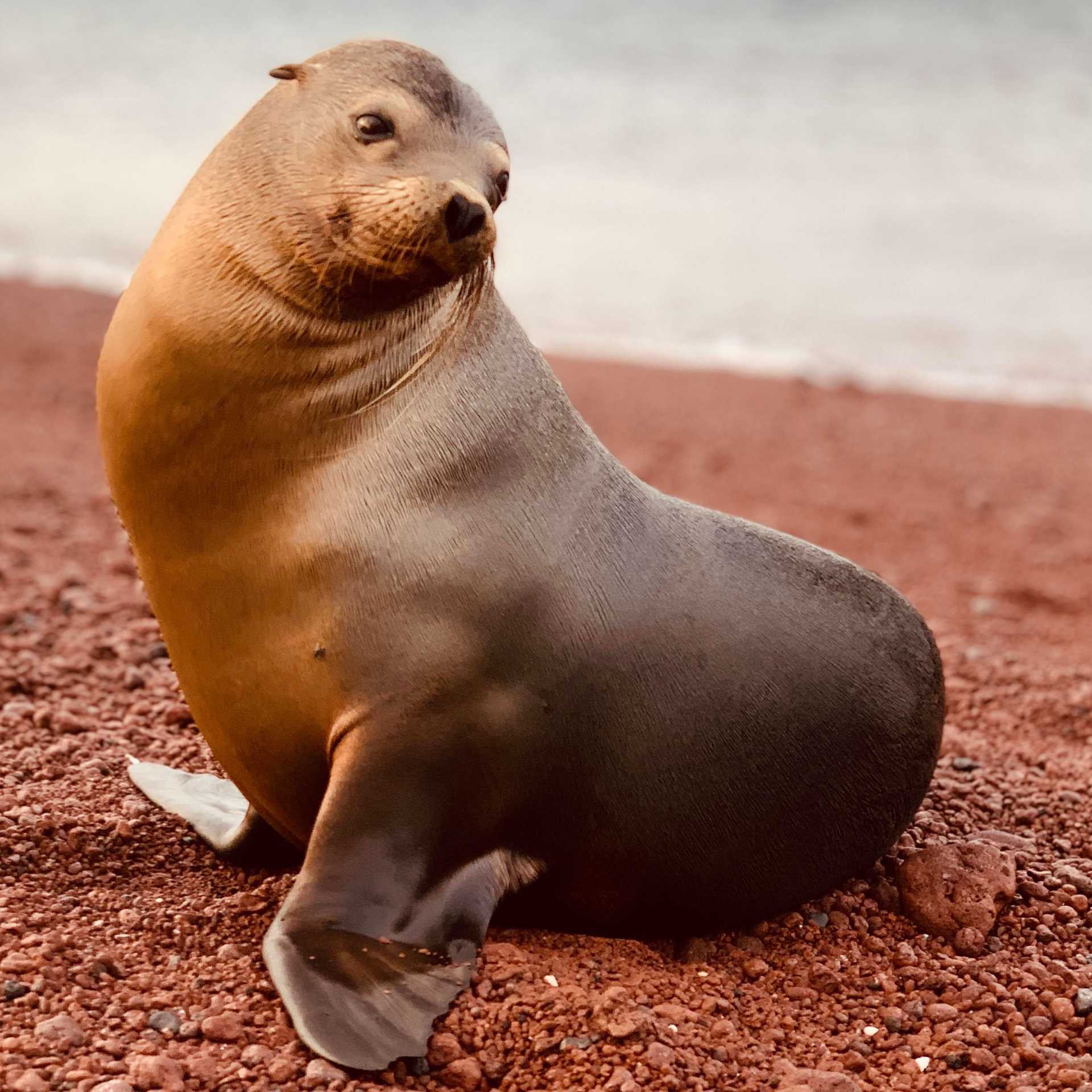 Portrait of a Galapagos sea lion. Taking advantage of the nutrient-rich waters, Galapagos sea lions are taking their time to reproduce. In this photo, you can see a female Galapagos sea lion on the beach on Rabida Island. —Salvador Cazar, Naturalist