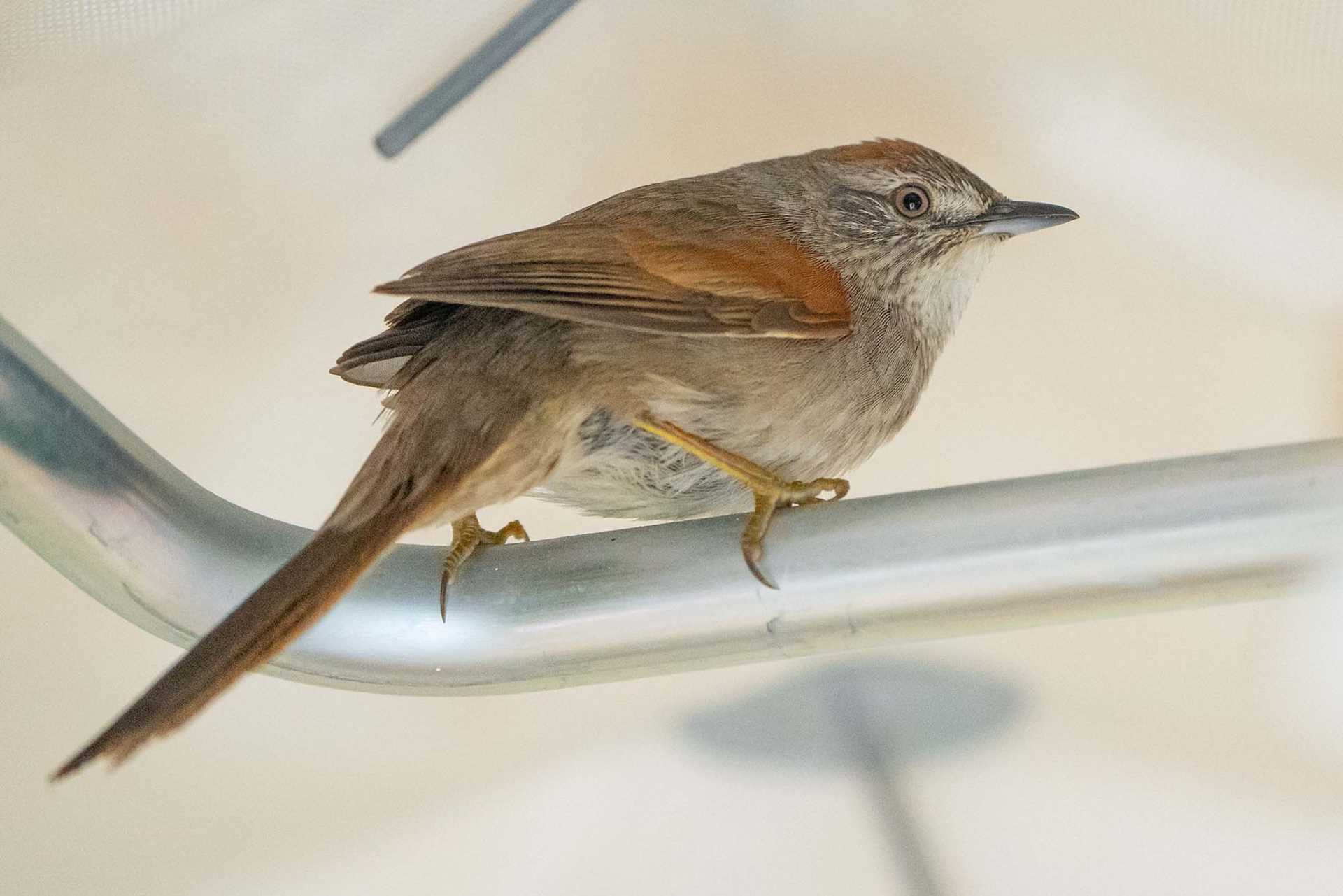 Far from sight of land, a stiff wind greeted us this morning, along with a surprising array of winged land animals that were blown out to sea: hundreds of moths and at least seven birds took refuge on our ship. Possibly our most exotic visitor for the day was this dapper juvenile male bay-capped wren-spinetail. He took a particular liking to our paint store and resisted my attempts to coax him back into a safer place. He eventually continued on his way. —Conor Ryan, Naturalist