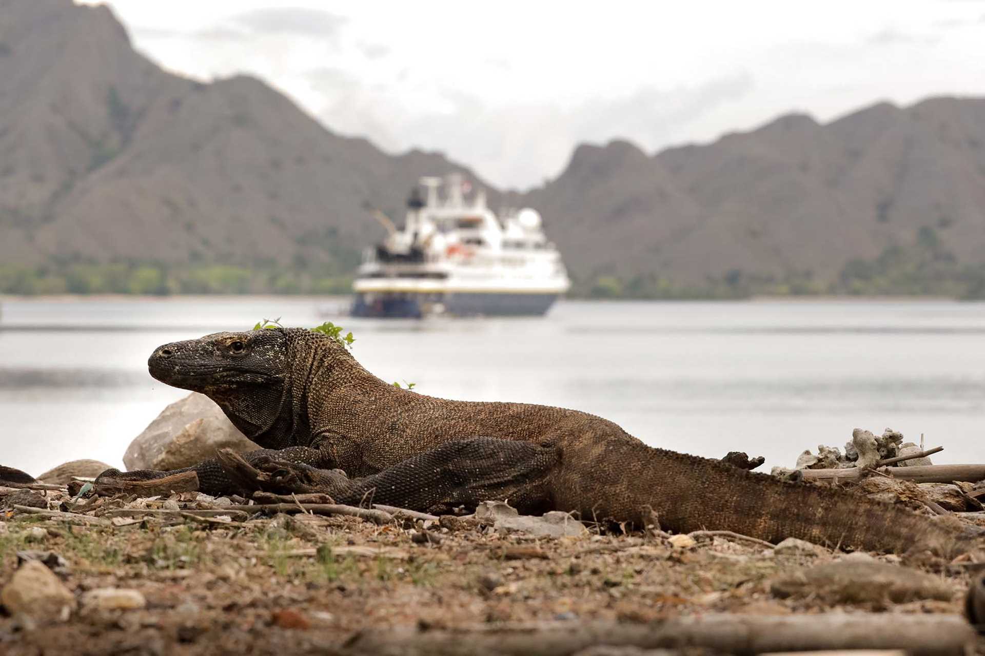A Komodo dragon rests on the ground with National Geographic Orion in the waters beyond at Komodo National Park in Indonesia. The park is the only place in the world where these creatures are endemic, and it hosts about 5,700 giant lizards. —Lisa Hornak, Naturalist/Photographer
