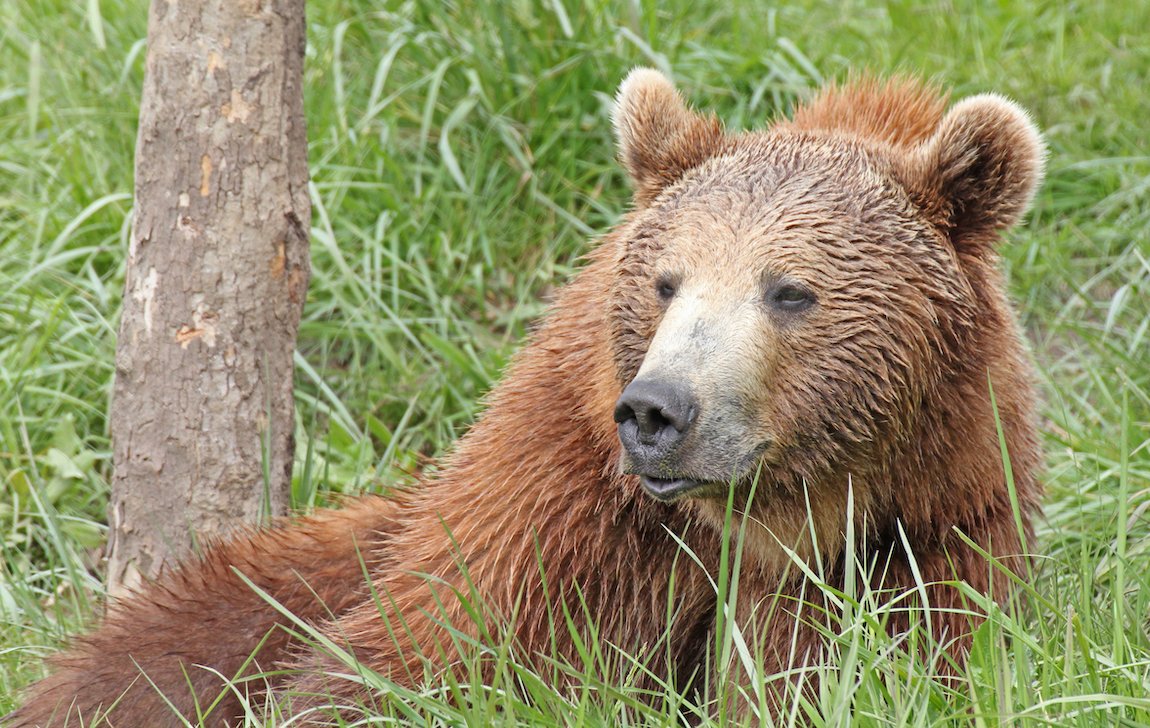 Slightly lighter in color than their coastal cousins, their white tipped fur gives them a "grizzled" look, the source of their name. Also like a brown bear, grizzlies have a distingushable large shoulder hump, the result of a mass of muscles that give the bears additional strength both for digging and hunting. These communicative bears use a range of sounds, including grunts, growls, and moans, to converse with their young or potential mates and they rub their bodies on trees to alert other bears to their presence.
