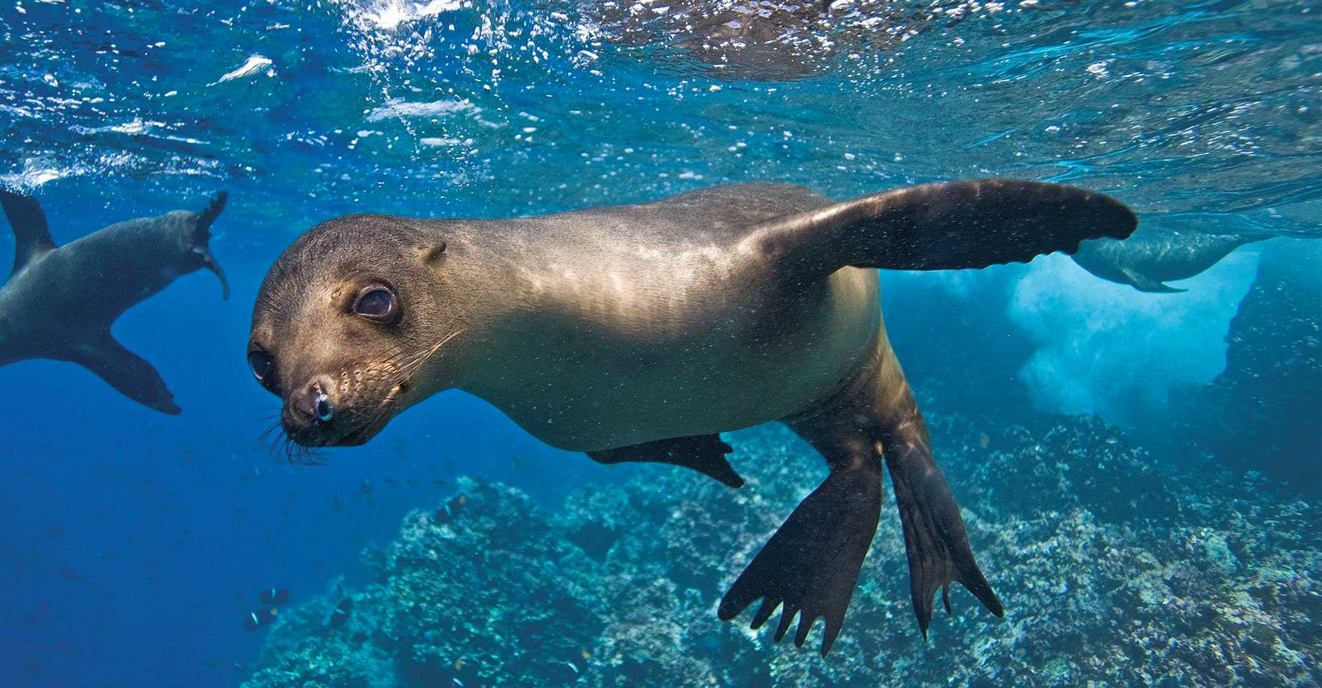 As entertaining as they are to see from the surface, the best show is performed under the water. These pinnipeds are incredibly agile swimmers who propel through the sea using unique sweeping motions called “claps.” When a sea lion “claps,” it stretches its fore flippers out to the sides, sweeps them down, then tucks them against the body creating a streamlined torpedo shape. One “clap” lets them glide effortlessly along, leaving the sea lion free to twist or roll with very little additional movement. These sociable animals are also very curious so, while you’re enjoying their balletic antics, don’t be surprised if they swim right up for a look, or even a playful nip on your fins.
