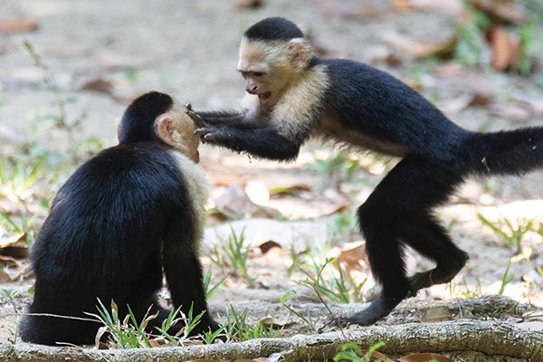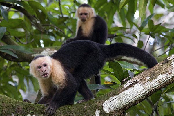 White-faced capuchins were first discovered in the 15th century when European explorers visited the forests of the New World. Capuchins earned their name thanks to the dark caps of hair atop their heads which quickly called to mind Capuchin monks in their deep coffee-colored hooded robes. (Cappuccinos, Italian for “little hood,” owe their name to the friars too). Also known as white-headed or white-throated, these monkeys are the only one among eight species of capuchins to sport jet-black hair framed by white (sometimes yellowish) hair around the face and upper chest.